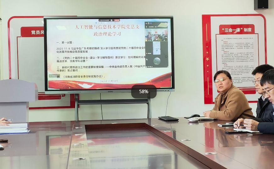 2025年11月18日,公司党总支组织郑州校区和开封校区全体党员及教职工,开展政治理论学习活动。本次学习活动由公司党总支书记崔琳主持。主要学习内容有:一、第一议题:2025-11-8 习近平在广东考察时强调,深入学习宣传贯彻党的二十届四中全会精神,以全面深化改革开放推动高质量发展;二、《党的二十届四中全会<建议>学习辅导百问》原文学习:如何理解优化高校布局、分类推进改革、统筹学科设置?三、新时代思想政治工作的重要制度保障——中央宣传部负责人就《中国共产党思想政治工作条例》答记者问;四、《河南省消防安全责任制实施办法》。