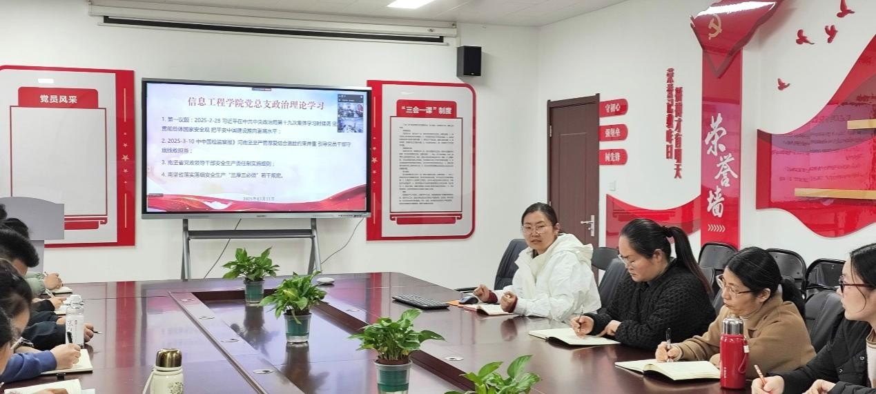 2025年3月11日,信息工程公司党总支组织郑州、开封两校区全体党员及教师,在郑州校区A514、开封校区F314以腾讯会议视频连接,开展政治理论学习活动。本次学习活动由yl9193永利副经理夏丽珍主持,全体党员及教职工参加会议。主要学习内容有:1.第一议题:习近平在中共中央政治局第十九次集体学习时强调 坚定不移贯彻总体国家安全观 把平安中国建设推向更高水平;2. 《中国纪检监察报》河南坚持严管厚爱结合激励约束并重 引导党员干部守底线敢担当;3. 河南省党政领导干部安全生产责任制实施细则;4. 河南省落实落细安全生产“三厚三必须”若干规定。