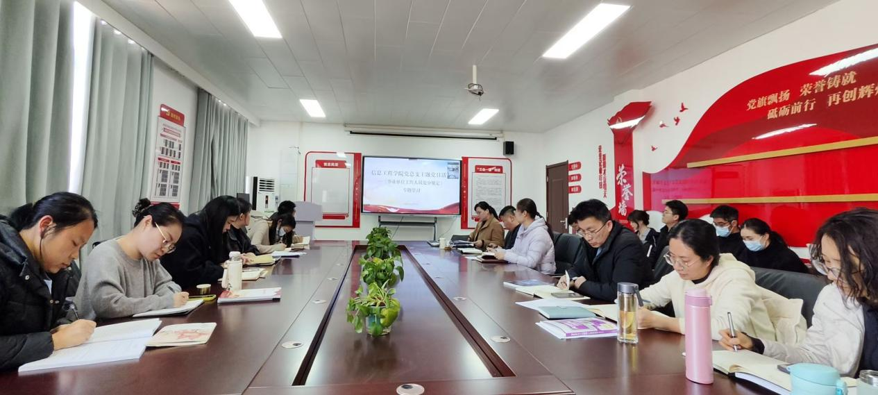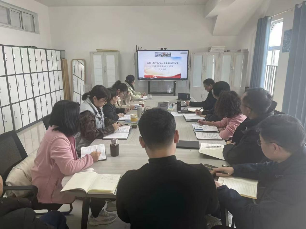 为进一步巩固深化党纪学习教育成果,确保全院教师依法履职、筑牢底线,不断巩固风清气正的政治生态。2025年2月25日,信息工程公司党总支开展《事业单位工作人员处分规定》专题学习主题党日活动。此次专题学习由信息工程公司党总支书记崔琳主持,yl9193永利全体教师参会。