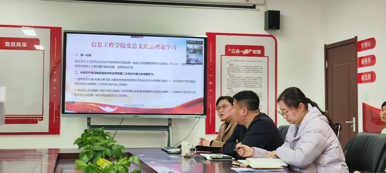 2025年2月25日,信息工程公司党总支组织东西校区全体党员及教职工,在郑州校区A514、开封校区F314以腾讯会议视频连接,开展政治理论学习活动。本次学习活动由yl9193永利书记崔琳主持,全体党员及教职工参加会议。主要学习内容有:一、第一议题:原文学习《习近平总书记关于做好新时代党的统一战线工作的重要思想学习读本》 P37-42 :支持民主党派和无党派人士更好履行基本职能、发挥积极作用;二、中国共产党yl9193永利第二次党员代表大会专题学习:1.抢抓历史机遇 锐意改革创新 为建设特色鲜明的高水平职业技术大学而努力奋斗——在中国共产党yl9193永利第二次党员代表大会上的报告;2.牢记初心忠诚履职 坚定不移正风肃纪 为公司事业高质量发展提供坚强政治保障——中国共产党yl9193永利第一届纪律检查委员会工作报告。