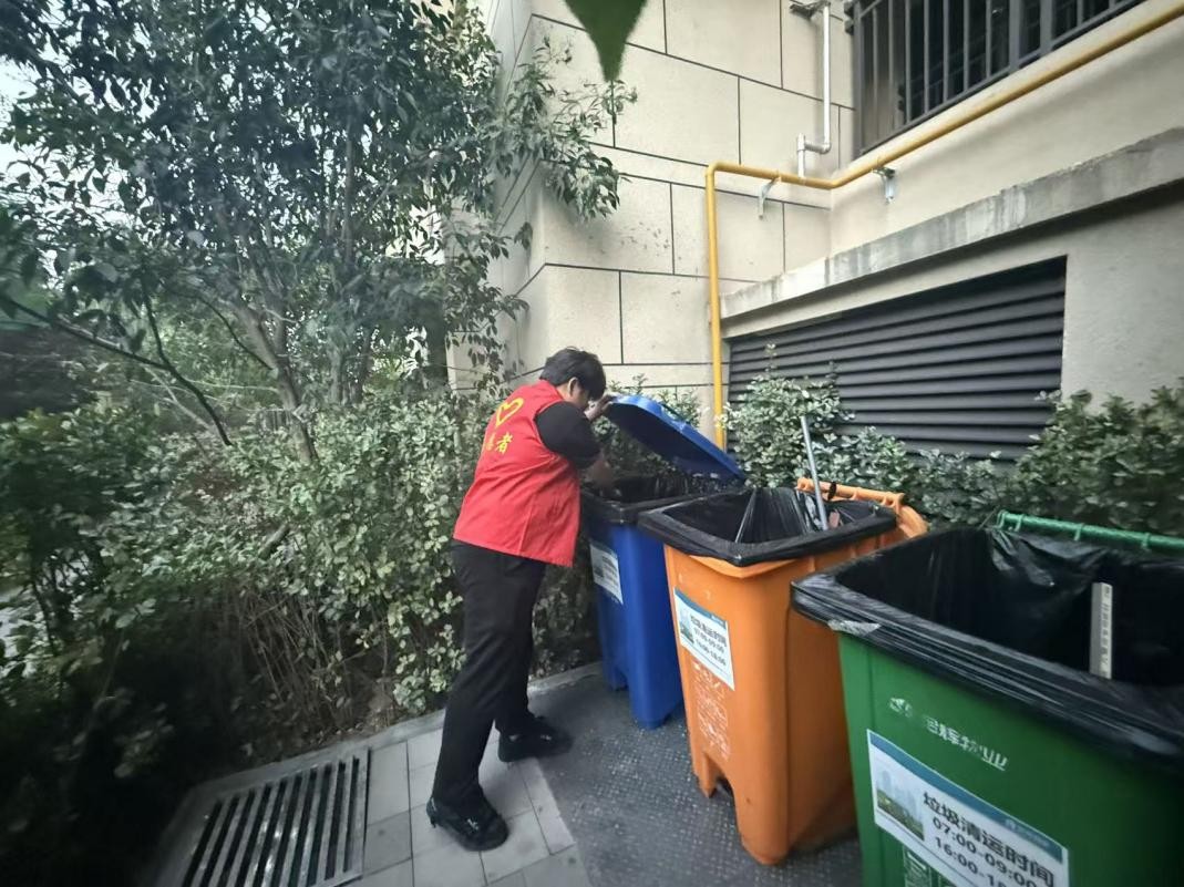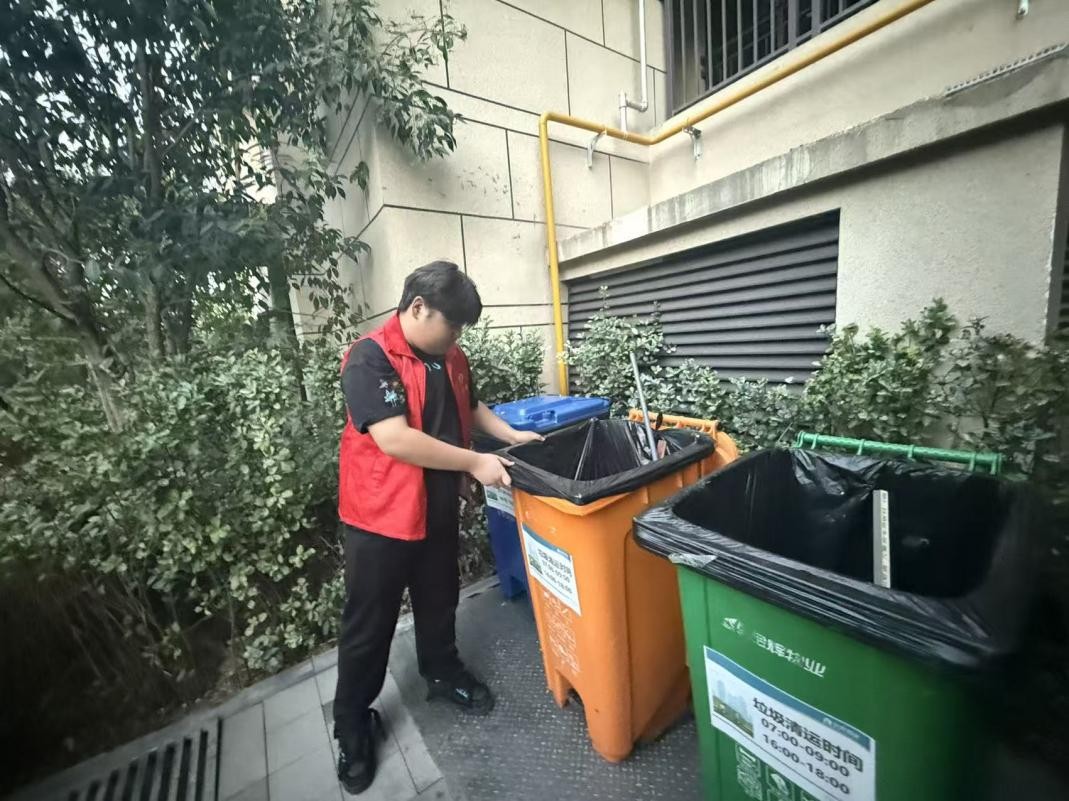 次日上午,金辉优步花园小区15号楼旁的垃圾分类投放点成了我的“战场”。我帮着社区工作人员擦拭分类垃圾桶,用抹布抹去桶身的污渍与异味,检查每个桶的投放情况。遇到拎着垃圾袋的居民,便笑着迎上去:“阿姨,菜叶属于厨余垃圾,您看这个绿色桶”“大哥,旧报纸记得投蓝色可回收桶哦”。听着他们说“现在分清楚啦”,我知道环保意识正随着这些对话悄悄生长。