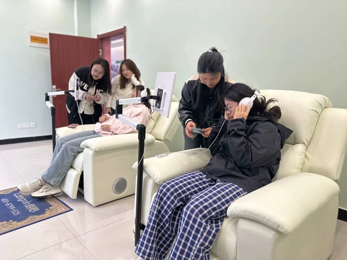 随后,带领同学们参观了各个中心功能室,包括心理沙盘室、个体心理咨询室、团体活动室、情绪宣泄室等。每组同学均有序体验了各个功能室的相关功能,同学们放松身心投入其中,与小组成员积极互动,欣赏员工作品,参与活动创作。