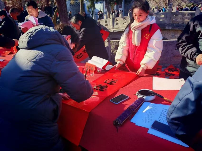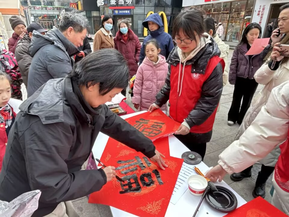活动当天,现场热闹非凡,充满了欢声笑语。我的主要工作是协助书法老师们完成春联书写活动。书法老师们全神贯注,将满满的祝福融入到每一副春联之中,随后赠与现场的居民。我在一旁认真地为老师们递纸、研墨,全力配合他们的工作。同时,我时刻留意着现场的秩序,及时引导居民排队,避免人群拥挤,确保活动能够安全、有序地进行。